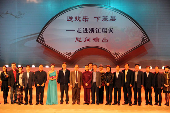“廣大文藝工作者要把人民滿意作為最高標準,把服務群眾作為基點和歸宿,站穩群眾立場,增進群眾感情,立志做人民喜愛的作家藝術家,不斷創作生產出思想性藝術性觀賞性相統一、人民喜聞樂見的優秀文藝作品,把更好更多的精神食糧奉獻給人民。”在剛剛結束的第九次全國文代會、第八次全國作代會上,胡錦濤總書記的重要講話再次強調文藝工作需要以人為本,要為人民抒寫、為人民放歌。為積極貫徹落實胡錦濤總書記重要講話精神,11月28日——第九次全國文代會閉幕僅3天,中國文聯、中國曲協便組織藝術家來到浙江瑞安,為當地群眾送去了由歡樂因子釀制的精神食糧。