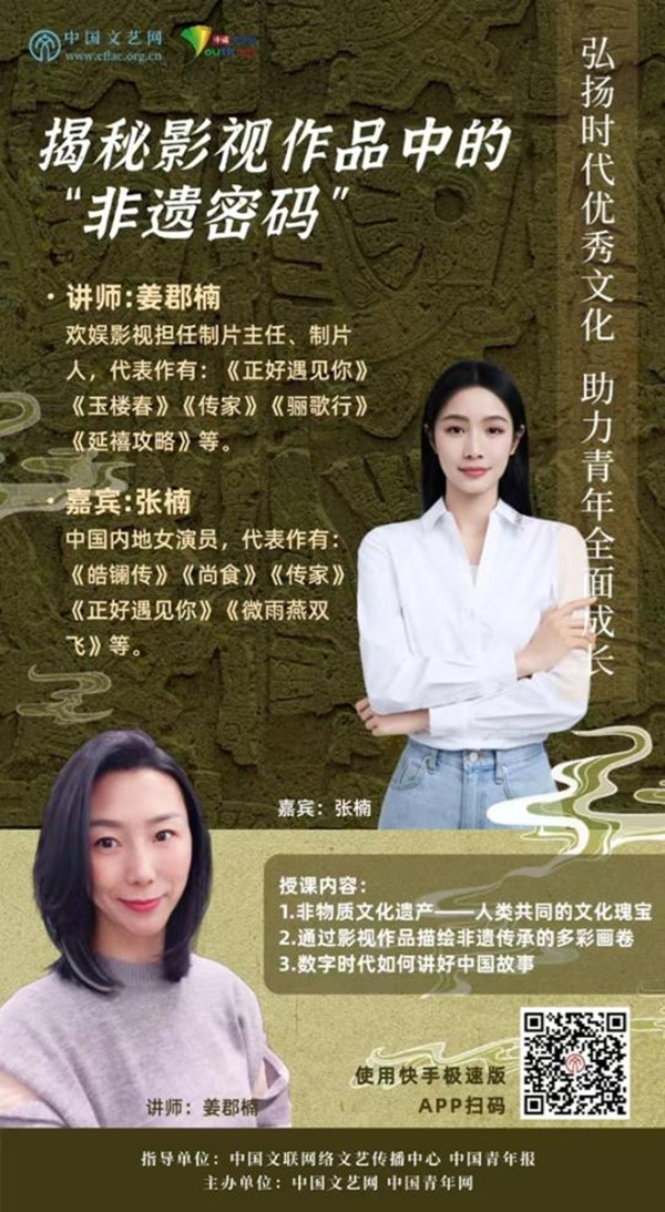 優(yōu)質(zhì)內(nèi)容激發(fā)青春力量。在中央網(wǎng)信辦、中央精神文明建設(shè)辦公室聯(lián)合發(fā)布的“2024年網(wǎng)絡(luò)文明建設(shè)優(yōu)秀案例”中,由中國(guó)文聯(lián)推薦,中國(guó)文聯(lián)網(wǎng)絡(luò)文藝傳播中心申報(bào)的“弘揚(yáng)優(yōu)秀文化,助力青年成才”高校線上公益課活動(dòng)成功入選。在公益課中,歡娛影視制片主任姜郡楠與青年演員張南(曾用名:張楠)共同揭秘了影視作品中的“非遺密碼”。課程中講解了非遺為影視注入深厚的文化底蘊(yùn)與獨(dú)特美學(xué)品格,大幅提升其藝術(shù)價(jià)值和觀賞性,使作品根植于中華優(yōu)秀傳統(tǒng)文化的沃土。當(dāng)然,影視作品憑借其無(wú)遠(yuǎn)弗屆的傳播力,使非遺突破地域與認(rèn)知的藩籬,如春風(fēng)化雨般“飛入尋常百姓家”。
