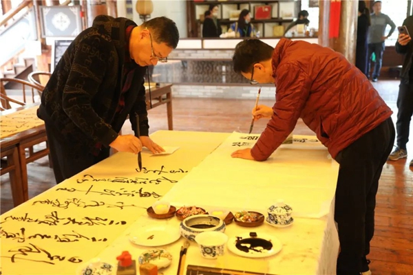 中國(guó)書協(xié)會(huì)員、縣書協(xié)主席張志敏和浙江省書協(xié)會(huì)員、縣書協(xié)副主席許智勇現(xiàn)場(chǎng)共同創(chuàng)作書法