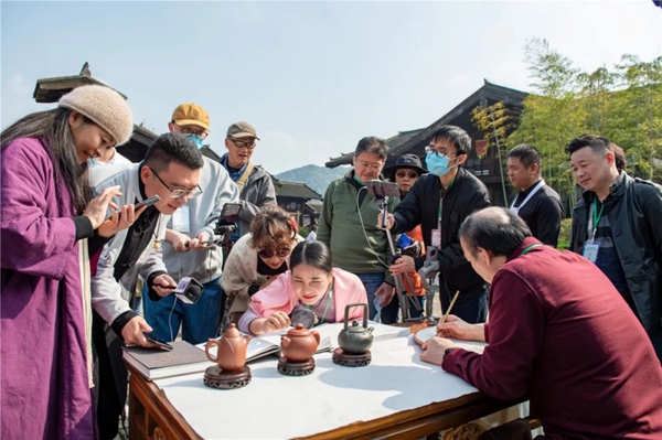 縣委常委、宣傳部部長(zhǎng)陳少鵬用刻有“長(zhǎng)興精神:大氣、開放、實(shí)干、爭(zhēng)先”的紫砂品茗杯喝茶出鏡,為長(zhǎng)興特色文化產(chǎn)業(yè)紫筍、紫砂代言