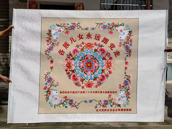 陳云珍為中國(guó)共產(chǎn)黨第二十次全國(guó)代表大會(huì)特別創(chuàng)作的羌繡作品《各族兒女永遠(yuǎn)跟黨走》