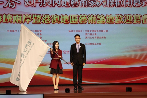 冀彥偉代表中國文藝志愿者協(xié)會向澳門文藝志愿者協(xié)會授旗