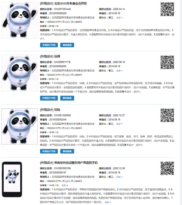 在提交商標申請的同一天,北京冬奧組委也向國家知識產權局提交了4件與冰墩墩相關的外觀設計專利,并于2020年獲得授權。