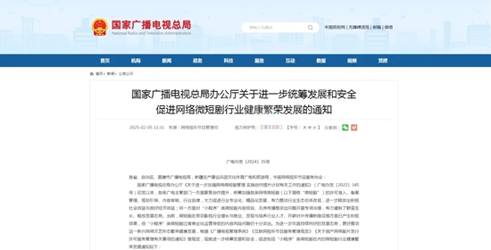 2月5日,國(guó)家廣播電視總局官網(wǎng)發(fā)布《國(guó)家廣播電視總局辦公廳關(guān)于進(jìn)一步統(tǒng)籌發(fā)展和安全促進(jìn)網(wǎng)絡(luò)微短劇行業(yè)健康繁榮發(fā)展的通知》。以下為通知全文↓↓↓↓↓