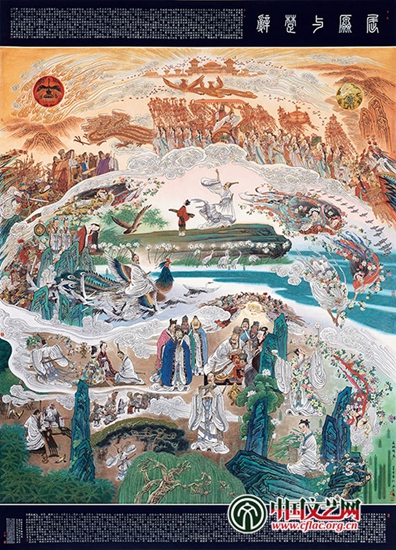 馮遠(yuǎn)創(chuàng)作的另一件作品《屈原與楚辭》,也是整個(gè)中華文明歷史題材美術(shù)作品系列中的一件。屈原是代表中國(guó)愛國(guó)知識(shí)分子的形象,大家都很熟悉。馮遠(yuǎn)說,他采用了《離騷》和《天問》篇來構(gòu)成他的畫面,《離騷》相當(dāng)于帶有屈原自傳體性質(zhì)的辭賦,他的人生為楚國(guó)效力,后受到猜疑排擠,要離開這個(gè)國(guó)家時(shí)又眷念不舍,是一種路漫漫兮吾將上下而求索的精神狀態(tài)。馮遠(yuǎn)就通過中國(guó)傳統(tǒng)壁畫的組合方式串聯(lián)在一起,用中國(guó)繪畫的色彩來表達(dá)整個(gè)故事,打破時(shí)空,多情節(jié)并置,形成了一種地下現(xiàn)實(shí)世界和天堂幻界結(jié)合的景象,根據(jù)屈原辭賦非常瑰麗、極富想象力、文采燦爛的表述來把內(nèi)容組合在一起,既寫實(shí)又寫意,還有象征表現(xiàn)主義的手法融入在內(nèi)。馮遠(yuǎn)告訴記者,他和參加這次美術(shù)工程創(chuàng)作的其他百位藝術(shù)家一樣,完全不考慮付出是不是要得到相應(yīng)的回報(bào),而是努力用心來描寫中華文明歷史,能夠參與這樣一項(xiàng)創(chuàng)作工程,成為其中一員,他感覺非常榮幸。