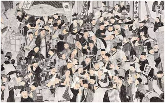 《宋代交子與紙幣發行》的整個創作過程,對周京新來講,就是深入到傳統和歷史之中,深入到具體生活的縫隙之中,扎根人民,在積累和解決問題的過程中獲得了突破。周京新說,很多同行的朋友說我們畫的這種感覺不一樣了,有不同了,我覺得這就是創新。創新都是有淵源、有道理的,不能隨便亂創、不能把自己胡來,或者不到位的一些做法,就當成是創新,不能說只要跟以前不一樣了就是創新。習總書記說既要像小鳥一樣在每個枝丫上跳躍鳴叫,也要像雄鷹一樣從高空翱翔俯視。我覺得這就像畫畫的空間關系處理一樣,在《宋代交子與紙幣發行》中,既要有宋代的整體歷史氣息,又要有微觀的、對每個人物眼神、服飾等細節的深入把握和了解。我覺得在我們的創作中,總書記說的很多精彩論斷,用在我們繪畫理論上,都是相通的,宏觀的非常到位,微觀的非常精準。周京新說,大道理都是相通的,正大的道理、堂堂正正宏觀的大道理都是和微觀相通的,習總書記的講話,和文藝家具體在做的工作、創作都是相通的,一點都沒有隔閡,是對文藝家最大的促進和鞭策。