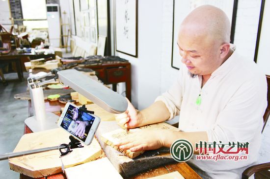 國家級非物質文化遺產項目十竹齋木版水印技藝代表性傳承人魏立中展示木版水印刻版環節 彭 揚 攝