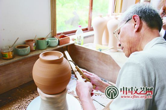 中國青瓷大師、“龍泉青瓷燒制技藝”傳承人陳壇根在直播現場展示龍泉青瓷跳刀工藝 彭 揚 攝