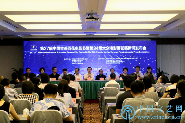 8月9日,第27屆中國金雞百花電影節暨第34屆大眾電影百花獎新聞發布會在京舉行。圖為發布會現場。中國文藝網 韓雪竹 攝