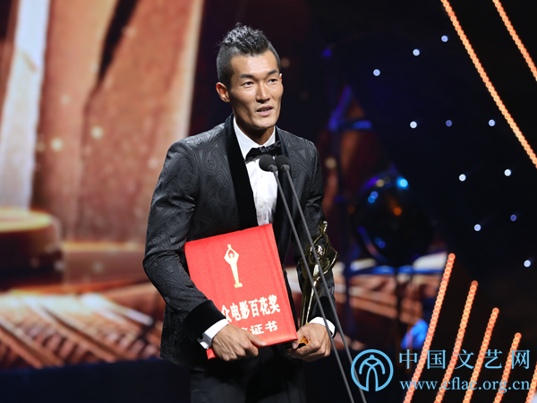 11月10日,第34屆大眾電影百花獎頒獎典禮暨第27屆中國金雞百花電影節閉幕式在廣東佛山舉行。圖為最佳男主角獎獲得者吳京發表獲獎感言。中國文藝網 韓雪竹攝