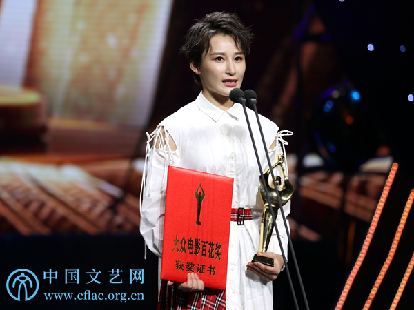 11月10日,第34屆大眾電影百花獎頒獎典禮暨第27屆中國金雞百花電影節閉幕式在廣東佛山舉行。圖為最佳女配角獎獲得者蔣璐霞發表獲獎感言。中國文藝網 韓雪竹攝