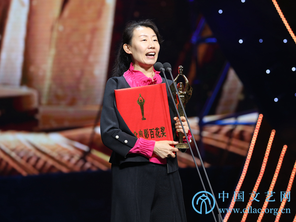 11月10日,第34屆大眾電影百花獎頒獎典禮暨第27屆中國金雞百花電影節閉幕式在廣東佛山舉行。圖為《十八洞村》片方工作人員代表最佳女主角獎獲得者陳瑾發表獲獎感言。中國文藝網 韓雪竹攝