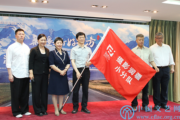 新疆文旅廳黨組成員、副廳長余潔向攝影潤疆小分隊(duì)授旗