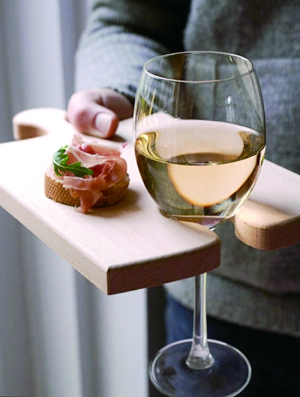 很多人在冷餐會上都會遇到這種情況,一手拿餐盤,一手拿酒杯,這樣我們就只能在餐桌附近活動了。而有了這個拼圖樣式的餐盤,我們就可以把食物直接放在上面,一側的小孔正好可以用來放高腳杯,搞個壽司芥末葡萄酒什么的,即使在冷餐會上也會顯得很從容。更加實用的是,如果食物較多,我們可以把兩塊拼圖拼在一起。而且它是用原木制作的,用來當切菜板也不錯。
