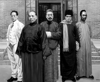 作品描繪了5位在中國近代學術史上具有重要影響的學術大師,從左向右依次為:趙元任、梁啟超、王國維、陳寅恪、吳宓。陳丹青將5人在畫面上一字排開,這也是他的典型構圖之一。陳丹青敏銳地抓住了眾人的不同特點,人物精神氣質躍然紙上而入木三分。畫面整體的棕黃色調醞釀了懷舊的濃郁氣氛,一種穩定而深沉的力量撲面而來。據雅昌藝術網顯示,這幅作品曾經在2007年保利秋季拍賣會夜場出現過,當時的成交價為1344萬元。