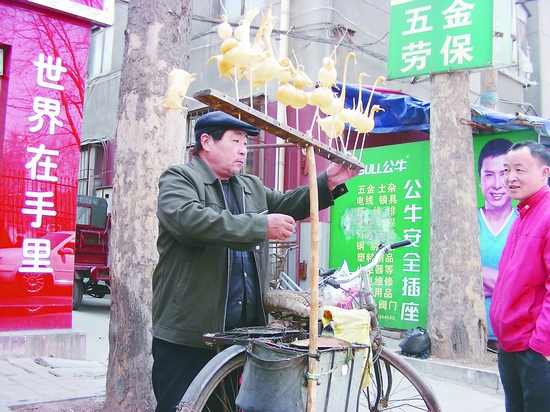 吹糖人是舊時北京的一個行業(yè),北京話為“吹糖人兒”。小販們肩挑挑子走街串巷,挑子一頭是一個帶架的長方柜,柜子下面有一個半圓形開口木圓籠,里面有一個小炭爐,爐上有一個大勺,中間放滿了糖稀(據(jù)說是麥芽糖溶化所得)。糖人木架分為兩層,每層都有很多小插孔,為的是插放糖人。這玩意兒好看、好玩,玩完后還能吃,一般孩子都喜歡,見著就走不動了,不是纏著大人要買,就是跑回家去要錢,實(shí)在沒錢的也不肯離去,眼巴巴地盯著這些糖人。有的小孩圖快,就付錢買一個現(xiàn)成的;有的則指定形狀要求現(xiàn)做。這時,小販就用小鏟取一點(diǎn)熱糖稀,放在沾滿滑石粉的手上揉搓,然后用嘴銜一端,待吹起泡后,迅速放在涂有滑石粉的木模內(nèi),用力一吹,稍過一會兒,打開木模,所要的糖人就吹好了。再用葦稈一頭沾點(diǎn)糖稀貼在糖人上,就大功告成了。糖人有各種形狀,什么小鹿、金魚、耗子、燈籠、孫猴等,聽老人講,早些年都有走街串巷吹糖人的,為了讓生意好做,糖人可以不必用錢來買,而是用牙膏皮來換。兩筒牙膏皮就可以換一個孫猴或是其他的小糖人。這一直頗受兒童歡迎,常常有小孩子把家里沒有用完的牙膏擠出來,用牙膏皮去換糖人吃,即便挨打也覺著甜滋滋的。過去糖人很便宜,在不富裕的時候是兒童很喜愛的玩物。那時,家門口如果有“吹糖人”的,便會圍滿了小伙伴。如今兒童的玩物多了,糖人不再是單純哄孩子的東西了,“糖人”挑子也早已被人遺忘,在城市的街頭巷尾也很難覓其蹤跡。“撥浪鼓兒風(fēng)車轉(zhuǎn),琉璃咯嘣吹糖人”,每當(dāng)看到晶瑩剔透的糖人,總是會喚起塵封已久的童年記憶和那一份淡忘已久的歡樂與驚喜。現(xiàn)在估計已經(jīng)沒有什么人把吹糖人作為一門吃飯的手藝活兒了。希望吹糖人兒和剪紙、年畫、泥玩等一樣能夠受到人們的關(guān)注,能夠有人把這些古老的傳統(tǒng)手藝保存下去,流傳下去。